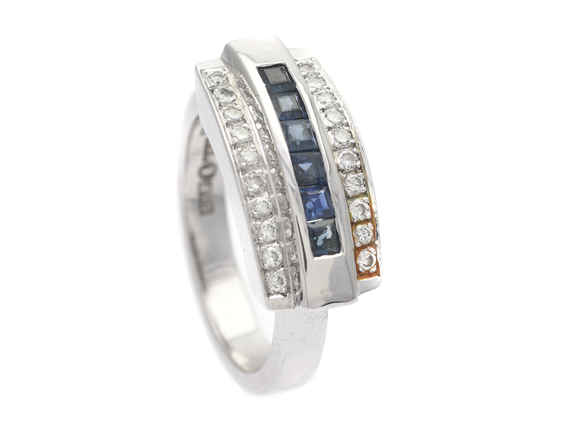 RING, 18K vitguld, 6 carréslipade blå safirer, 20 briljantslipade diamanter ca 0,20 ctv, ca TW-W/VS,Stjernswärd Juveler & Design, Stockholm 1992, stl 17 mm, vikt 7,9 g, 1 safir med nagg.