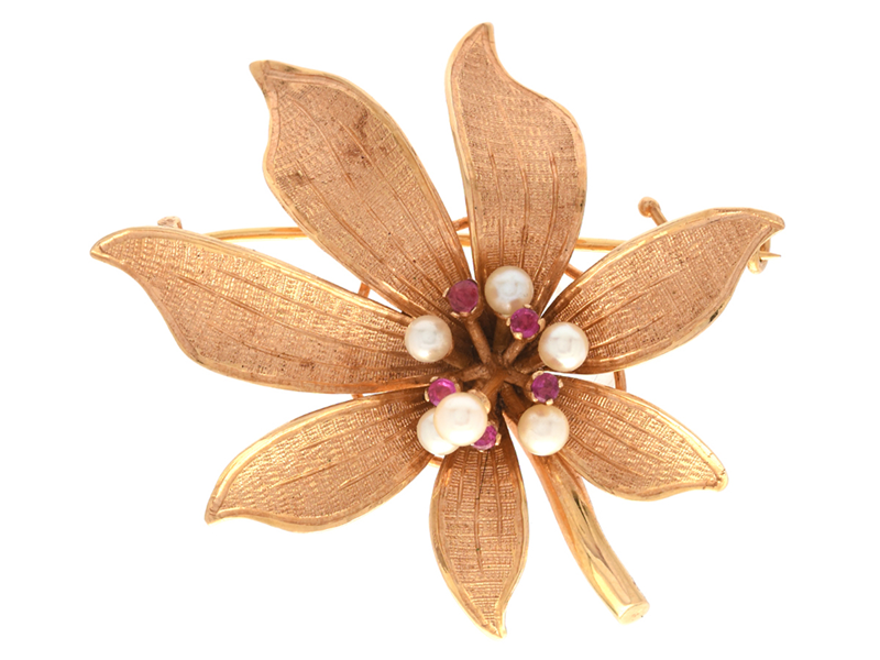 BROSCH, 18K guld, 6 odlade pärlor, 5 rubiner, blomma, Fryklund & Pålsson Guldateljen, Stockholm 1958, 4,5x4 cm, vikt 7,0 g.