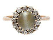 CARMOSÉRING, 18K guld, krysoberyll, kattöga ca 2,25 ct, gammalslipade diamanter ca 0,40 ctv, antik, stl 15,25 mm, vikt 3,2 g, slitna klor, ett par diamanter med skador.
