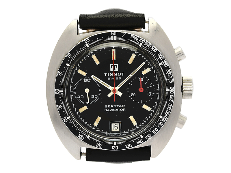 TISSOT, Seastar, Navigator, Cal 2070 (Valjoux 7734), Serie nr. 18484449, Boett nr. 40522 15, kronograf, herrur, 40,5 mm, stål, manuell, plexiglas, datum, skadad urtavla, buckla, läderband, ca 1974.