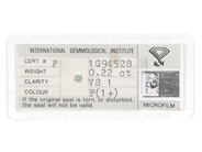 DIAMANT, briljantslipad, 0,22 ct, TW(F)/VS1, certifikat IGI F1G94528, plomberad.