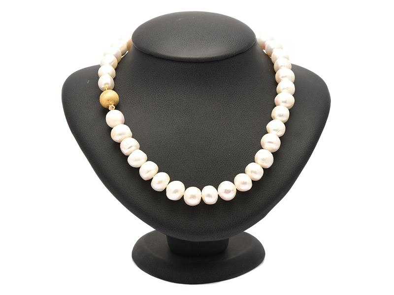 PÄRLCOLLIER, odlade något barocka sötvattenspärlor ca 11-12 mm, längd 44 cm, magnetlås i förgylld sterling silver, vikt 87,6 g, knutet.