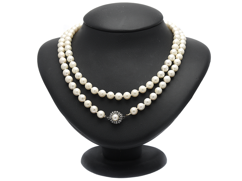 PÄRLCOLLIER, 18K vitguld, något barocka odlade saltvattenspärlor ca 7,30-7,40 mm, längd 88 cm, vikt 56,9 g.