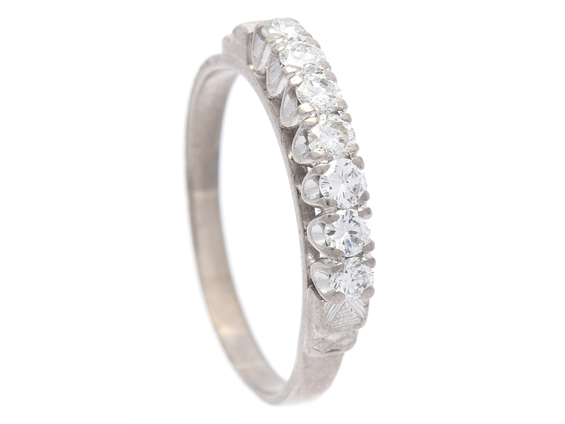 ALLIANSRING, 18K vitguld, 7 briljantslipade diamanter ca 0,53 ctv, ca TW/VVS-VS, stl 19,5 mm, vikt 3,3 g, två diamanter med skádor.
