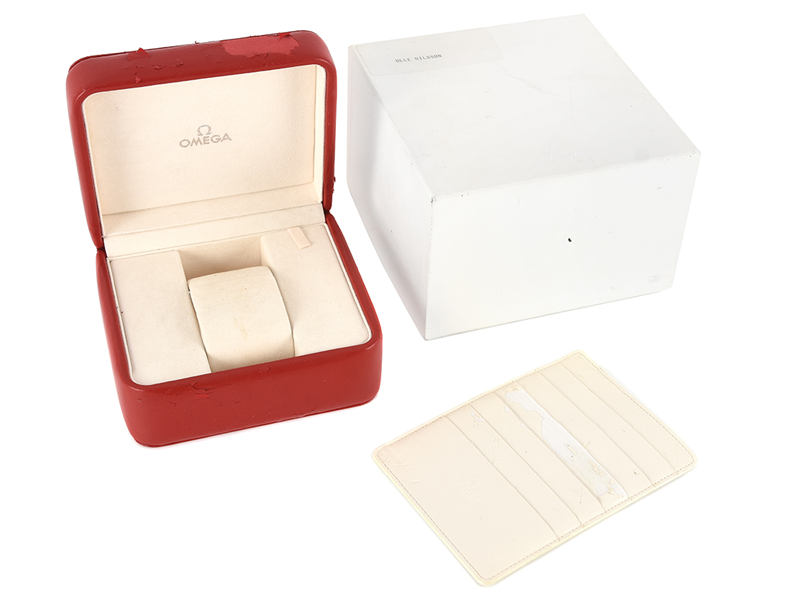 BOX, till Omega armbandsur, röd, 139 x 123 x 75 mm, skadad, certhållare, ca 2005, ytterkartong.