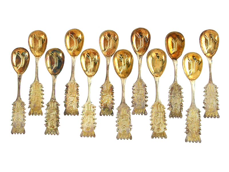 LAPPSKEDAR, 12 st, silver, delvis förgyllda, CO Persson; Haparanda 1948, längd 10cm, vikt 116,5 g, etui, monogram.
