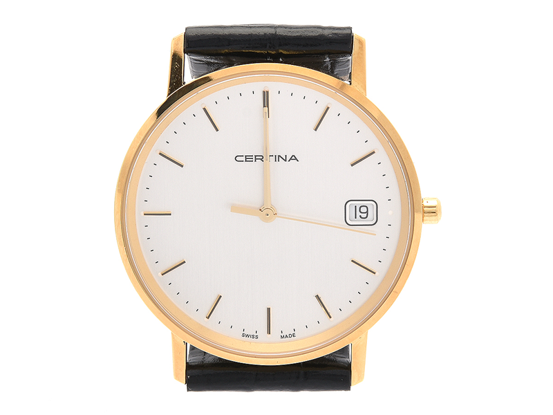 Certina 18K, refnr: 158928968, sernr: 15LA0000634, safirglas, 33mm, quartz (går ej), datum, läderarmband, cert -16, box, kartong