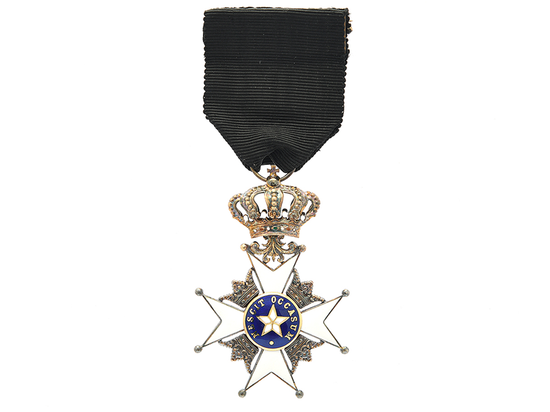 RIDDARTECKEN, förgyllt silver, Nordstjärneorden, emalj, bredd 39 mm, vikt med band 22,2 g, originaletui, inte mycket av förgyllningen återstår,