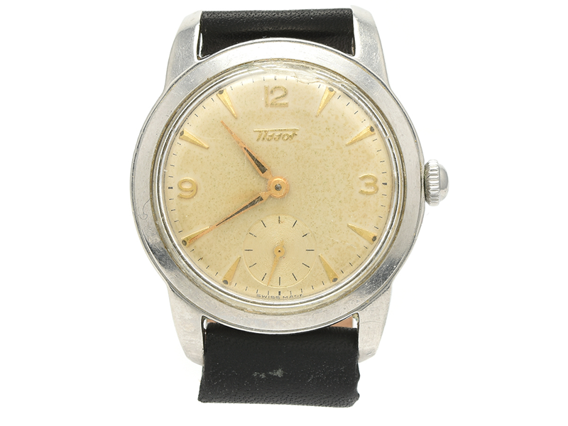 TISSOT, herrur, 35 mm, Cal 27B-1, Serie nr. 3192467, Boett nr. 6769 / 6770-8, stål, manuell, plexiglas, liten sekundvisare, skadad urtavla, läderband, ca 1954.