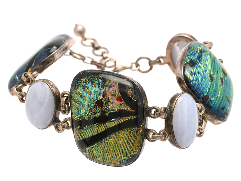 ARMBAND, sterlingsilver, cabochonslipad kalcedon, glasfusing, längd 22 - 25 cm, vikt 61 g.