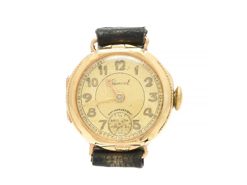 Damur Genial med boett 14K , manuell, med plast repigt glas, med läderband 20,5cm, brv 11,3g bucklor på baksidan, fungerar ej
