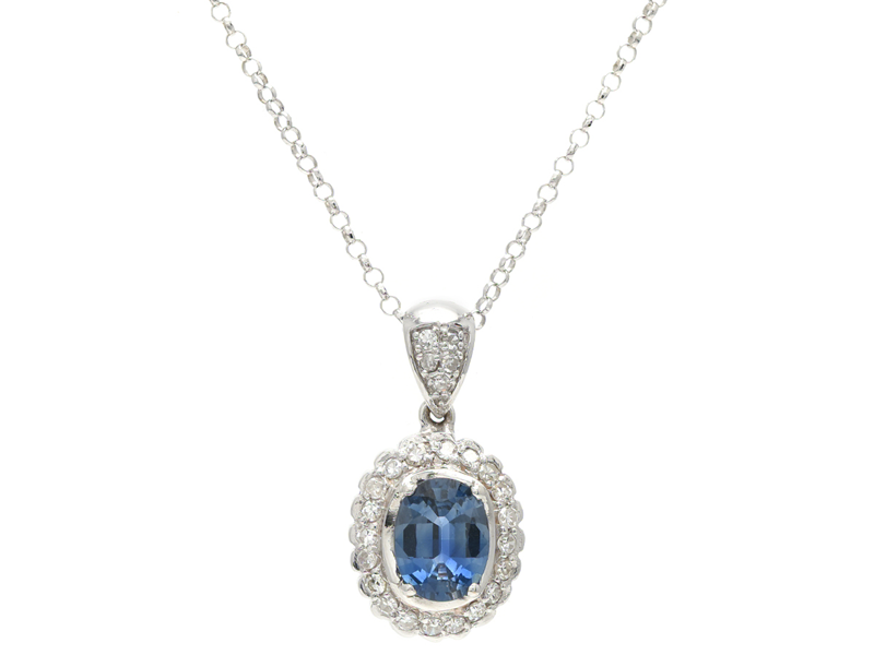 CARMOSÉHÄNGE, 18K vitguld, safir ca 1,71 ct, 25 åttkantslipade diamanter ca 0,39 ctv ca W/SI, längd 45 cm, vikt 5,7 g, en diamant är skadad och en har nagg.