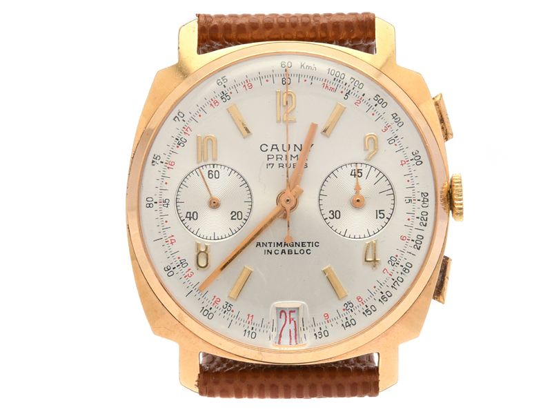 CAUNY, Prima, Cal Landeron 187, Boett nr. 32 10/187, herrur, 35 mm, doublé (10 micron), manuell, plexiglas, datum, läderband, ca 1970.