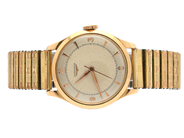 LONGINES, herrur, 35 mm, Cal 27.0S, Serie nr. 8663518, Boett nr. 5185 5 / 110, 18K guld, manuell, plexiglas, skadad urtavla, ca 1952, metallänk ej original.
