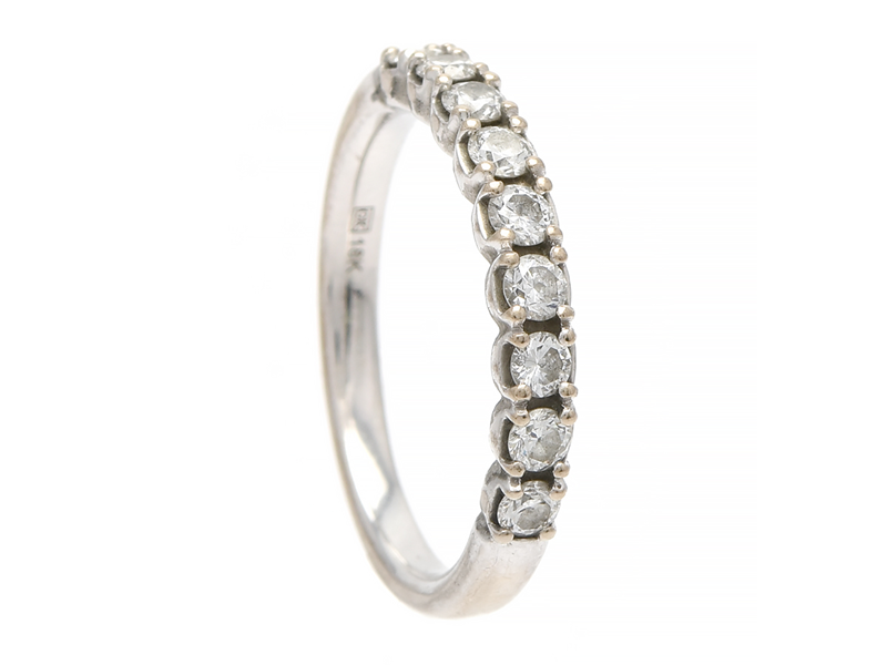 ALLIANSRING, 18K vitguld, 9 briljanter ca 0,48 ctv, ca W(H)/VS-SI, stl 16 mm, vikt 3,0 g, rodiering har släppt på skenan.