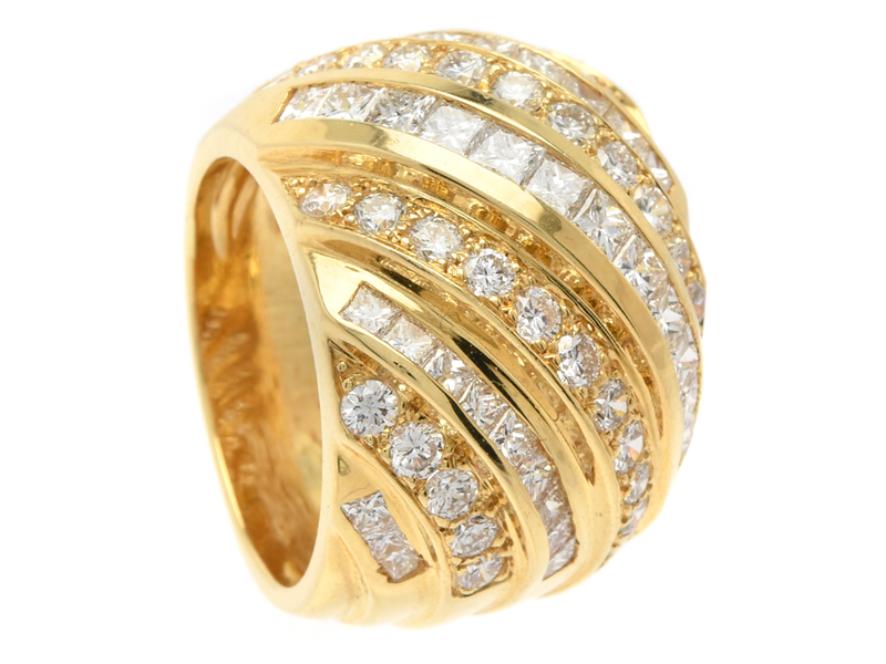 RING, 18K guld, 32 briljantslipade diamanter ca 1,22 ctv, 36 prinsesslipade diamanter ca 1,10 ctv, ca W-TCr(H-I)/VS, 4 prinsesser med nagg, stl 17 mm, vikt 18,4 g.