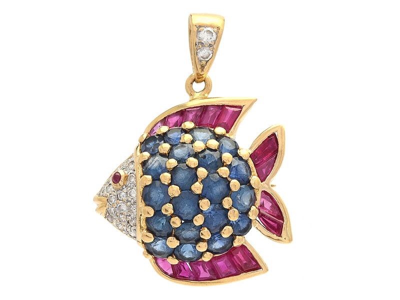 HÄNGE, 18K guld, safirer, rubiner, briljantslipade diamanter ca 0,12 ctv, fisk, höjd 24 mm, vikt 3,8 g.