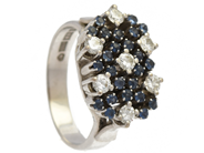 RING, 18K vitguld, 7 briljantslipade diamanter 0,42 ctv, ca W-TCr(H-I)/VS-SI, safirer, Staffan Hallberg, Uppsala 1995, stl 17 mm, vikt 7,1 g, svaga fattningar, en diamant är skadad, safirer med nagg/skador.