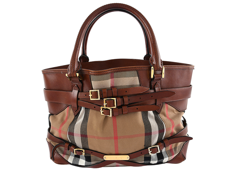 VÄSKA, BURBERRY, Horseferry House, rutigt tyg, brunt läder, guldfärgade beslag, 35x25x15cm, dustbag.