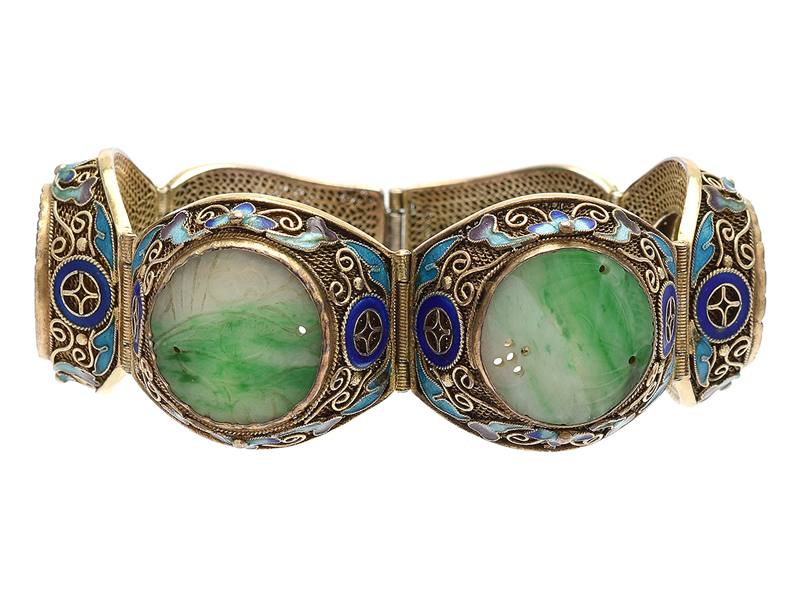 ARMBAND, förgyllt silver, emalj, jade, längd 17,5 cm, vikt 45,6 g, säkerhetskedjan saknar ögla.