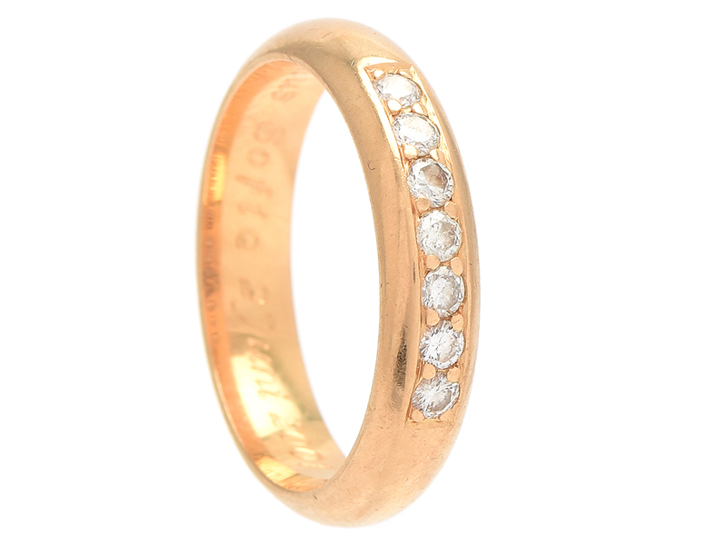 ALLIANSRING, 18K guld, 7 briljantslipade diamanter ca 0,35 ctv, stl 19,5 mm, vikt 7,9 g, gravyr.