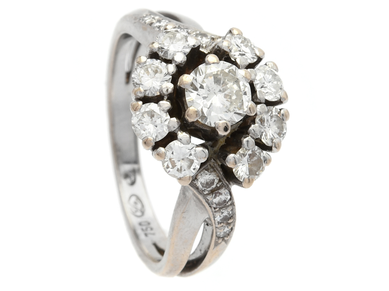 RING, 18K vitguld, briljantslipade diamanter ca 1,05 ctv, ca W-TCa/VS, stl 16,5 mm, ett par stenar är skadade, mittstenen är ca 0,37 ct.