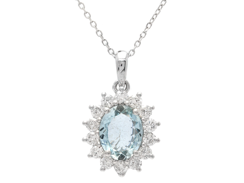 HÄNGE MED KEDJA, 18K vitguld, ovalfasetterad akvamarin ca 1,83 ct, 14 briljantslipade diamanter ca 0,54 ctv, ca TW-TCr/SI-P, höjd 20 mm, längd på kedjan 45 cm, vikt 3,2 g.