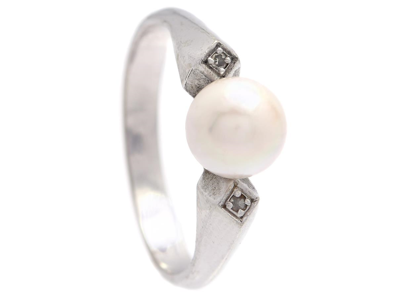 RING, 18K vitguld, 2 åttkantslipade diamanter, odlad pärla ca 6,9 mm, stl 17,25 mm, vikt 3,7 g.