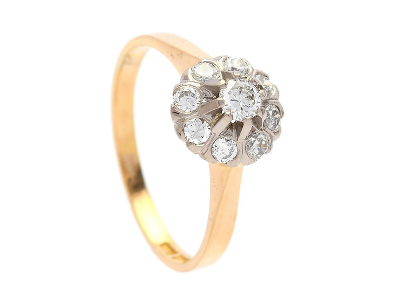 CARMOSÈRING, 18K guld/vitguld, 9 briljantslipade diamanter ca 0,50 ctv, ca TW-Cr(G-J)/SI, stl 17,75 mm, Eskilstuna 1977, vikt 3,3 g, en sten har nagg och en sten skadad.