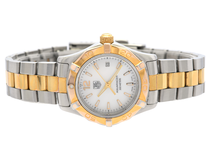 TAG HEUER, Aquaracer (300 METERS), Serie nr. RUN9652, Ref nr. WAF1424.BB0825, Boett nr. WAF1424, damur, 27 mm, bicolour, quartz, safirglas, datum, pärlemorurtavla, originallänk, viklås, Ref nr. FAB015-G-Y1/3112 G, cert, december 2013, box, ytterkartong.