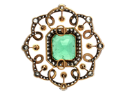 HÅRSMYCKE/BROSCH, 14K guld/silver, smaragdslipad colombiansk smaragd ca 20,60 ct, minor clarity enhancement, GCS certifikat 81300-55, 8 pärlor ca 4,4-4,7 mm, gammal- och rosenslipade diamanter ca 5,90 ctv, antik, Eduard Föhr, Stuttgart, mått 5,8x5,0 cm, smycket går att bära på flertal sätt med medföljande garnityr varav några i metall, originaletui. Proveniens Elisabeth Hasenkamp.