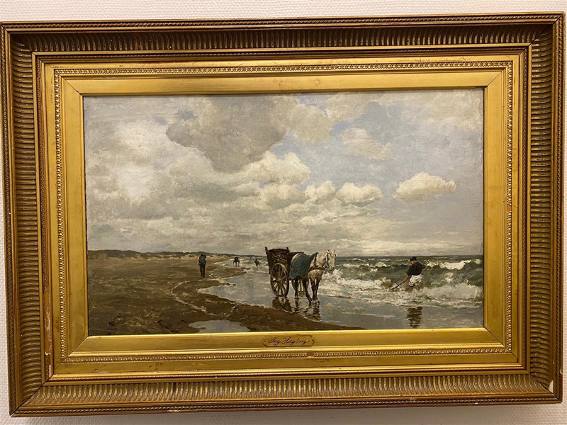 August Hagborg (1852-1921) Oljemålning på duk, strandmotiv, etikett på rygg: Morsieur A Hagborg, Au bord de la mer, ca39x66cm i ram med skador, Visas och hämtas på St Eriksgatan 20 i Stockholm