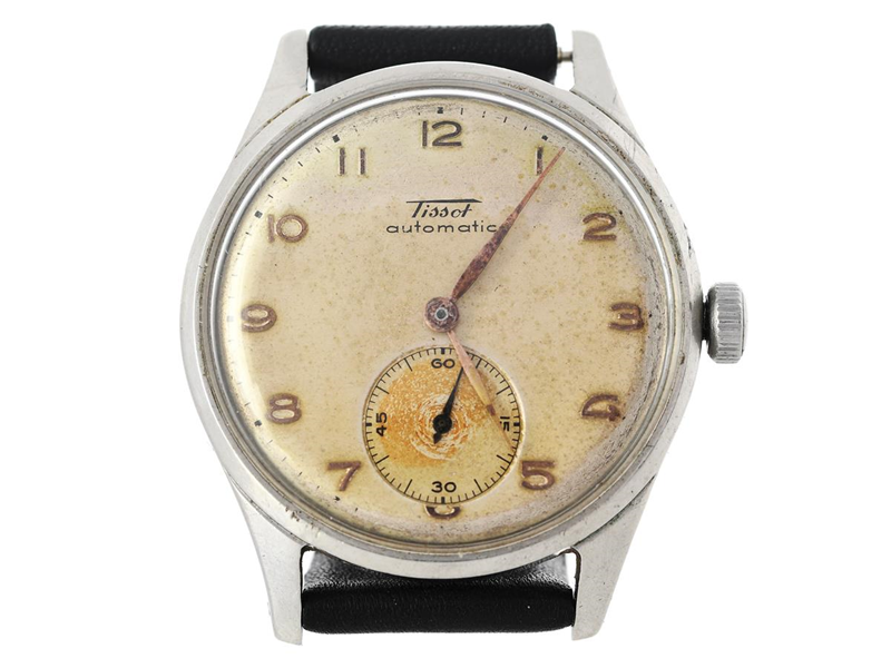 TISSOT, herrur, 35 mm, Cal 31-1, Serie nr. 1725966, Boett nr. 6540-1 / 662, stål, hammarautomat, plexiglas, liten sekundvisare, skadad urtavla, gravyr, läderband, ca 1946.