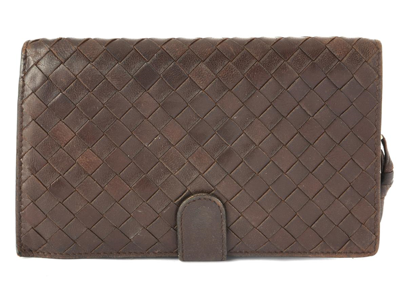 PLÅNBOK, BOTTEGA VENETA, Intrecciato, brunt flätat läder, 8 kontokortsfack, mynt, sedel, slitage.