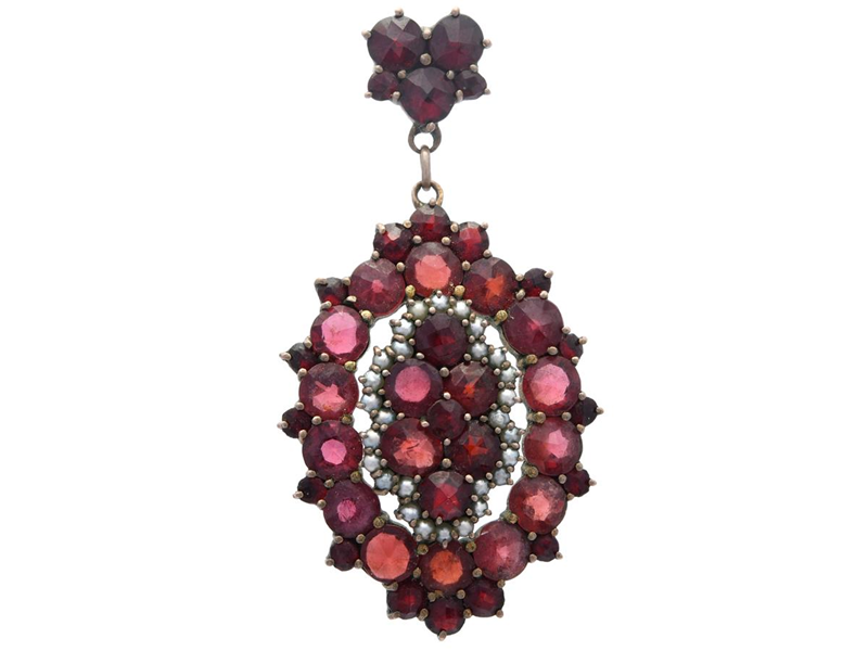 HÄNGE, metall, granater, små halvpärlor, bredd 22 mm, vikt 5,3 g.
