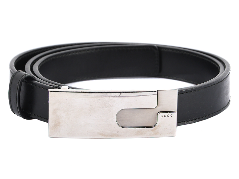 BÄLTE, GUCCI, svart läder, silverfärgat spänne, längd 75 cm, bredd 2 cm.