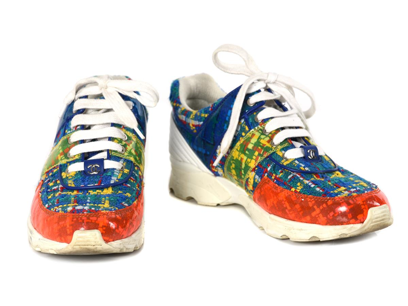 CHANEL, SNEAKER, Multi tweed, blå, gul, röd, stl 38½, snörning. Good condition.