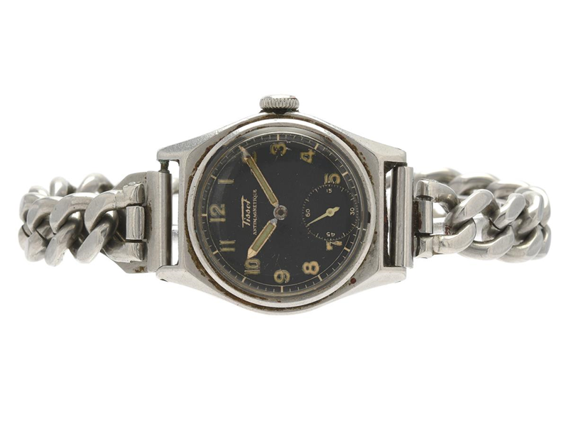 TISSOT, Antimagnetique, Cal 27, Serie nr. 1088750, Boett nr. 1036280, herrur, 31 mm, stål, manuell, plexiglas, liten sekundvisare, skadad urtavla, defekt, ca 1940, metallänk ej original.