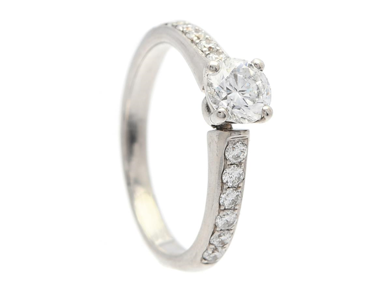 RING, 18K vitguld, briljantslipad diamant ca 0,52 ct, ca TW(F)/SI1, 12 briljantslipade diamanter 0,30 ctv, stl 16,25 mm, vikt 3,2 g.