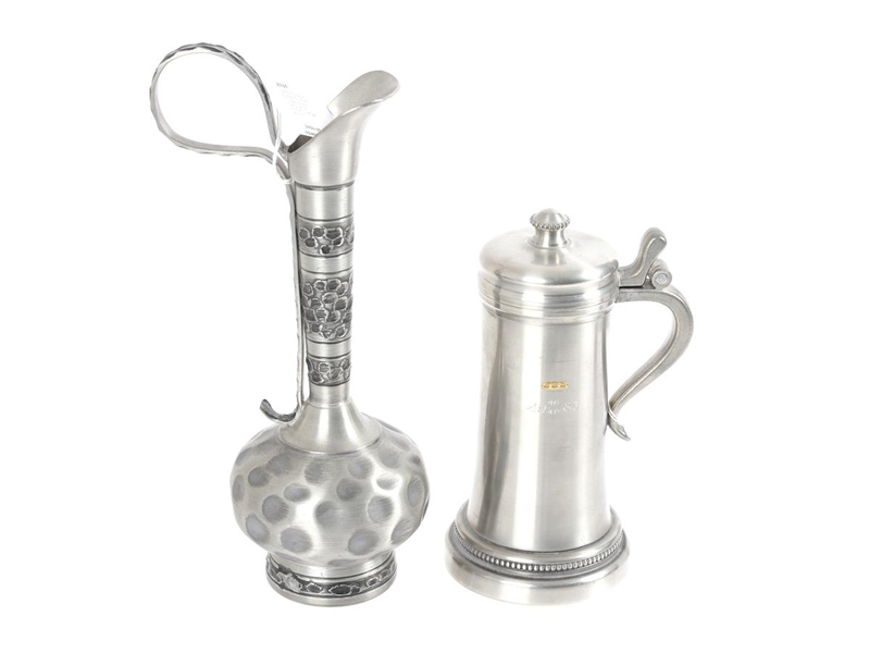Tenn, två delar; En karaff H: 25 cm Norge nr 189. En kanna med lock H: 18,5cm Svenskt Tenn graverad.