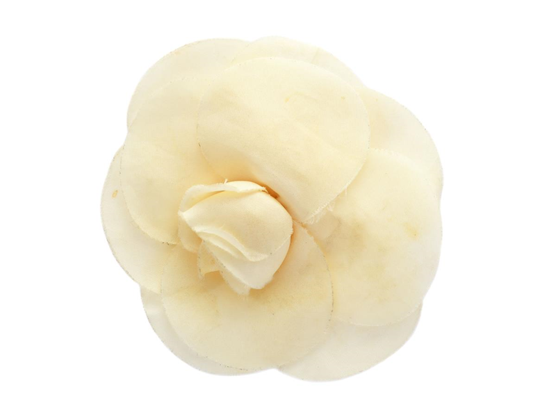 BROSCH, CHANEL, Camelia, beige siden, 9x9 cm, fläckar.