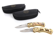 Fällknivar 2st Franklin Mint collector knives - Hunting med djurmotiv totallängd 17,5cm bladlängd 7,5cm med fodral. Ej med på visning.