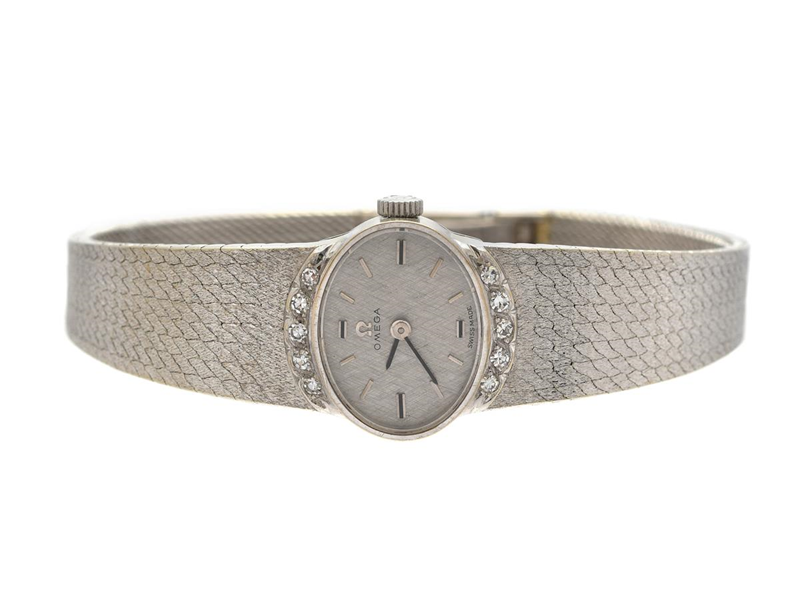 OMEGA, damur, 16,5 x 17,5 mm, Cal 485, Serie nr. 28563975, Boett nr. B46044 / 8211, 18K vitguld, manuell, safirglas, fornverk, diamanter på boetten (10 st.), integrerad originallänk, Ref nr. 811.703, längd 170-165 mm, totalvikt 36,4 gram, ca 1969.