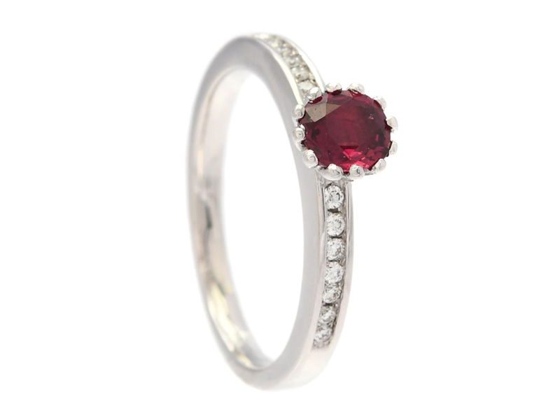 RING, 18K vitguld, ovalslipad rubin ca 0,71 ct, 14 briljantslipade diamanter ca 0,14 ctv, ca TW-TCr/VS-SI, stl 18+ mm, vikt 4,2 g, rubinen har naturliga håligheter på paviljongen och nagg på kronan.