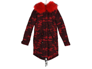 JACKA, BEST, Camo-Parka, vadderad, stl XS, två framfickor, krage i röd päls, knappar, dragkedja, snöre i midja.