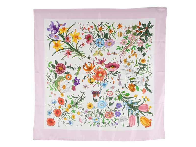 GUCCI, SCARF, Flora V. Accornero, 100 % siden, 90x90 cm, ljusrosa bård, vit bakgrund, flerfärgat blomstermotiv, originalask.