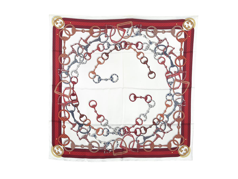 SCARF, GUCCI, Horsebite, 100 % siden, 90x90 cm, vit bakgrund, cerice, röd, guld, ask.