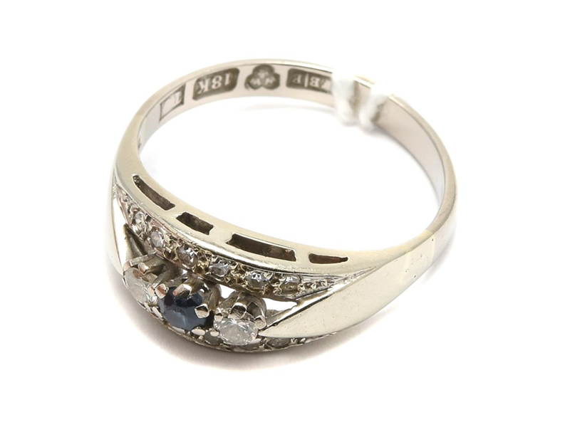 Ring 18K vitguld 4,1g Ø18¼ med diamanter 2xca0,05ct 12xca0,01ct med blå sten skev skena