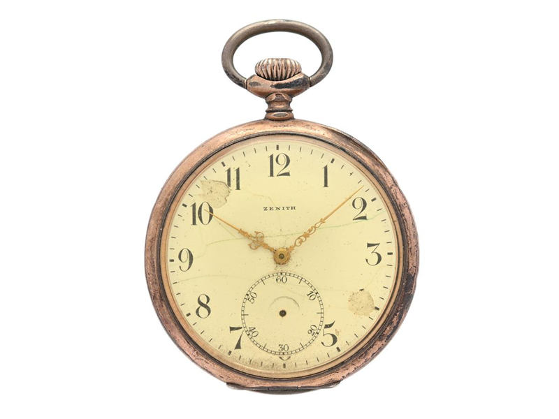 ZENITH, fickur, 51,5 mm, Serie nr. 1971359, Boett nr. 2927381 / 8543, silver (0,800), ankargång, saknar sekundvisare, skadad urtavla, defekt, bucklor, ca 1915.