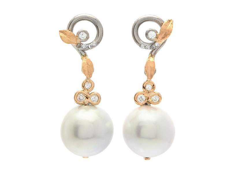 PÄRLÖRHÄNGEN, 18K guld/vitguld, Southsea pärlor, ca 12,5 mm, 18 briljantslipade diamanter 0,28 ctv, Mandelstam, höjd 31 mm, vikt 7,9 g, stift, originalask.
